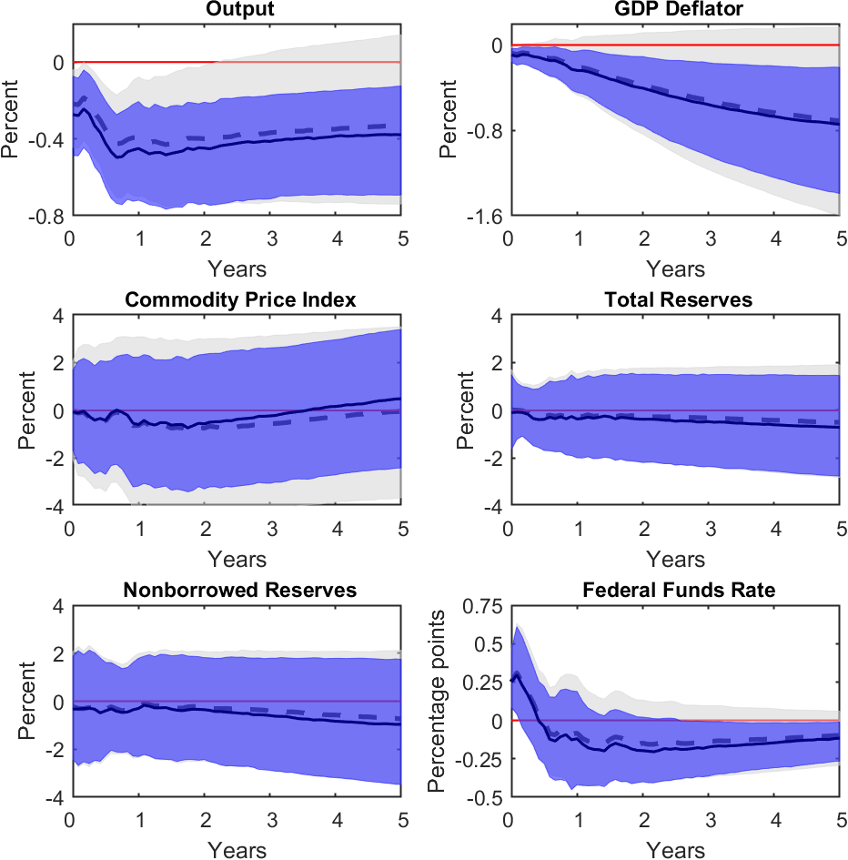 Figure 1. IRFs to a contractionary monetary policy shock. The lighter area uses only the sign restriction, while the darker area adds the correlation restriction.
